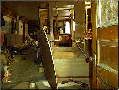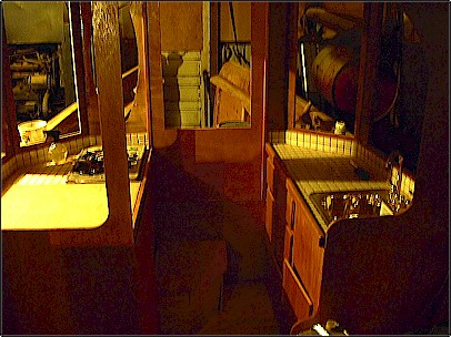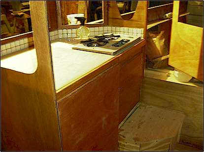 ceiling in the middle of the saloon. On the left is the stove and on the right is