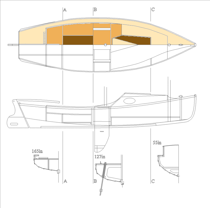 This boat is intended as a lightweight pocket cruiser with easily driven lines and a traditionally inspired sailplan. The epoxy lapstrake hull is based on a proven US type.