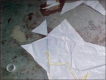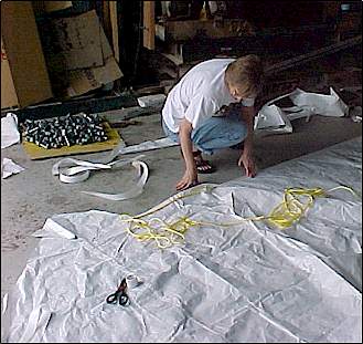 Polysails were followed. The double sticky tape is laid along the edge of the sail. 1/4 inch nylon rope is laid along the inside edge of the tape. The taped area is then folded to the inside, capturing the rope to form what is now the edge of the sail. |