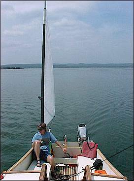 The real test was Pearl’s maiden voyage. We had a beautiful day at Lake Buchanan. The wind was light, but picked up now and then, heeling us over just a bit. The rigging still needed some fine tuning, but the sails did exactly what they were supposed to do. Moving almost silently through the water is like magic. The only sound is the small one that the ripples of our wake throw up. I’ve since been left reluctantly on shore when Pearl went out, and can report that from even a small distance the sails fit the boat perfectly (at least to my eye), and do not look the least bit