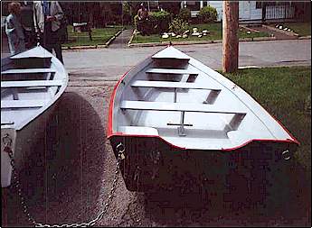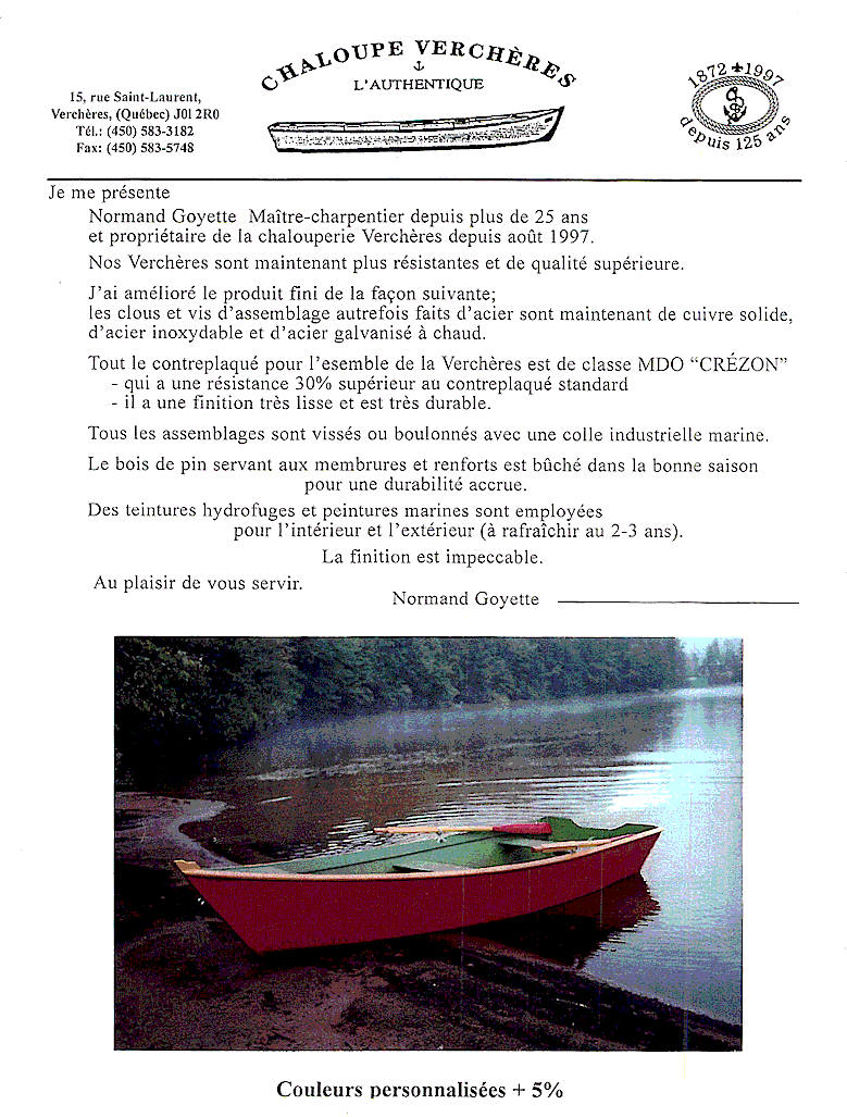 From the border between the USA and Canada, opposite Cornwall, Ontario, the scenic route 132 hugs along the south shore of the St-Lawrence River bypassing Montreal and Quebec City and going all along the Gaspe´ peninsula to the province of New Brunswick. About 50 years ago it was the main road between Montreal and Quebec City toward the Maritime Provinces. On this road, Vercheres is about 60 kilometers east of Montreal. This little municipality - with approximately 350 inhabitants at that time - used to be THE boat building capital of the French-Canadian chaloupes. The chaloupe is a kind of dory-skiff with lower sides and a wider beam as can be seen in the photographs. She is developed from a Double-Ender also shown in the pictures.