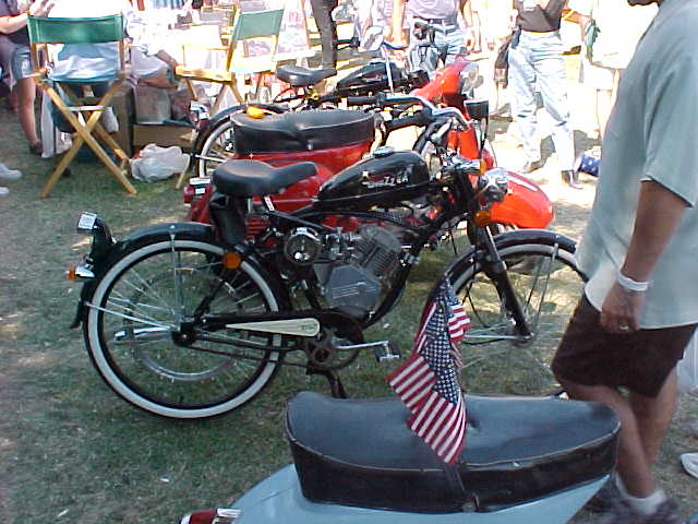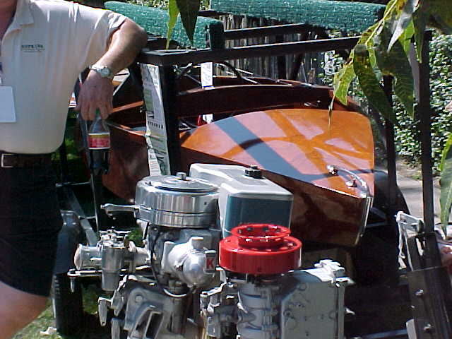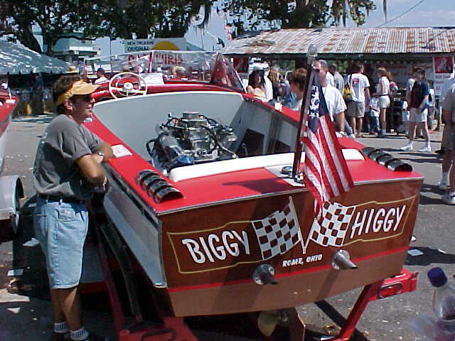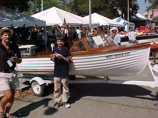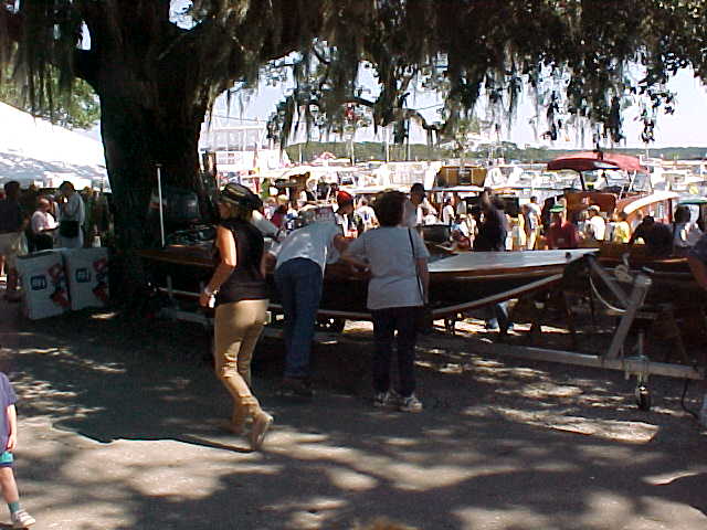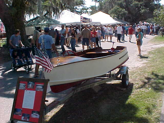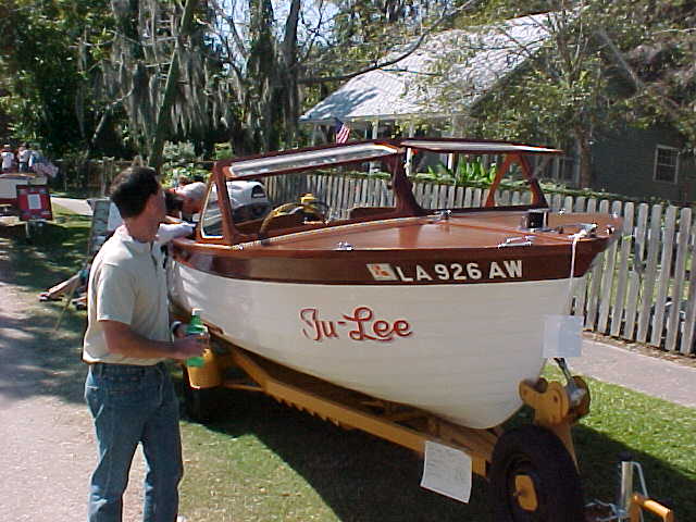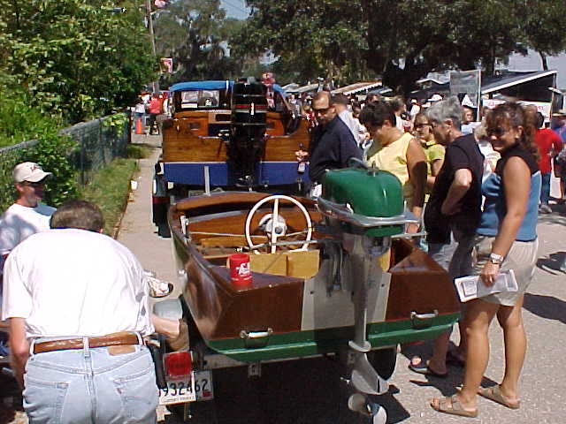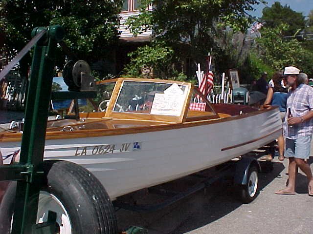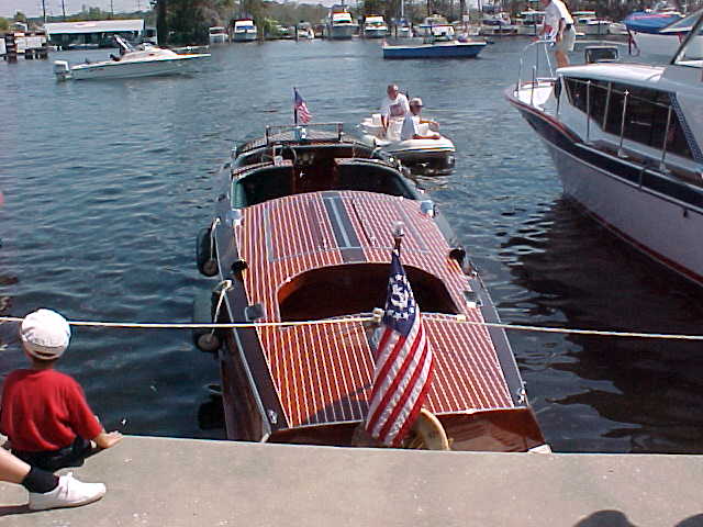 Runabout, River in background is lined with big wooden cruisers and sailboats |