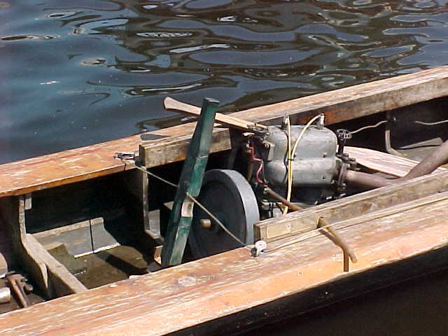 South Louisiana Swamp boat, Old engine, water cooled, big flywheel, reverses by changing timing and running backwards |