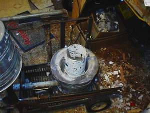 The crucible for melting the aluminum in is a piece of steel pipe cut from my scrap pile, with a plate welded to the bottom. As you can see from the picture, it is lined with what is called "kiln wash". This is some kind of clay solution, it helps keep the steel from oxidizing, and also keeps it from contaminating the aluminum.