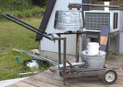 The furnace is an old barbecue grill I recycled. (the top was aluminum, and has been melted down already). The grills went on the bottom of the cart for the furnace to sit on. The furnace itself is a couple of $5 buckets from Home Depot, lined with homemade insulating refractory cement. Basically some fireplace cement from the local brick place, mixed with some play sand and perlite, both from Wal-Mart.