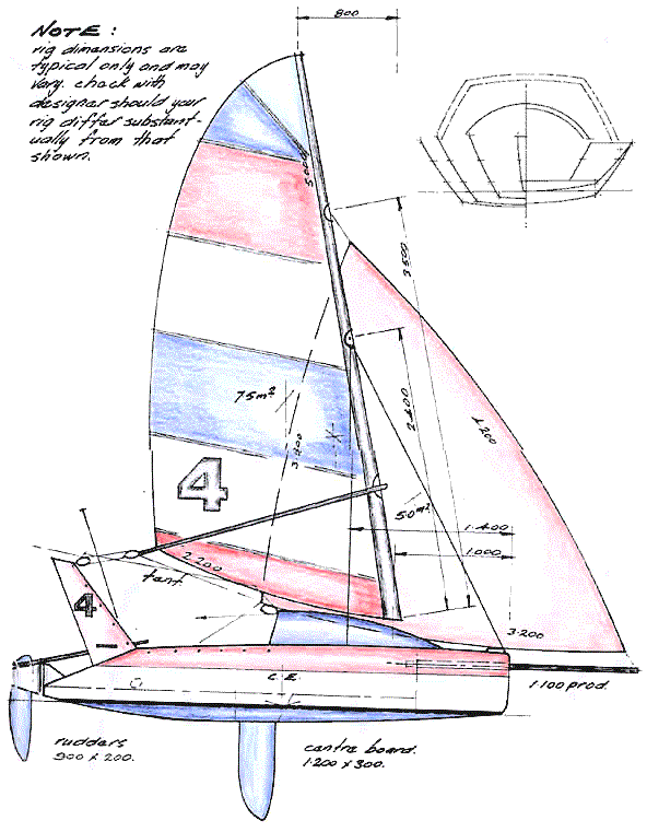 ACTION STATIONS is a modern beach cruiser/camper which will prove easy to build, light, and thrillingly fast to sail. She will be easy on the bank balance as the rig is from a windsurfer (the slight mods required to fit the stays would not prevent it returning to the normal duty when needed by the other brother), and most of the few fittings could be made in a home workshop or scrounged off a derelict dinghy.