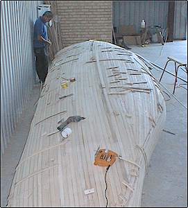 Photos show half hull planked waiting for the edge glue to cure (timber is