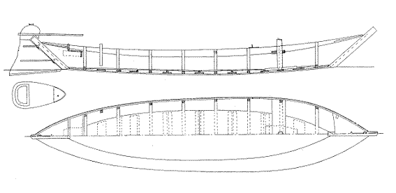 high bow and high tumbling-home sides. A narrow keel of about twelve (12)