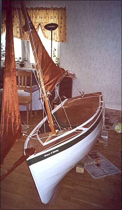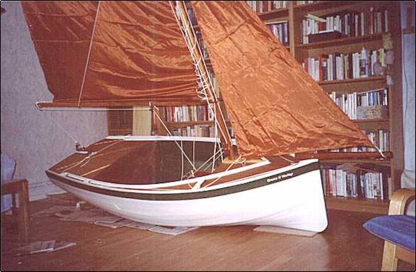 a 7´ sailing vessel with beautiful rounded lines, gaff cat rig and offset