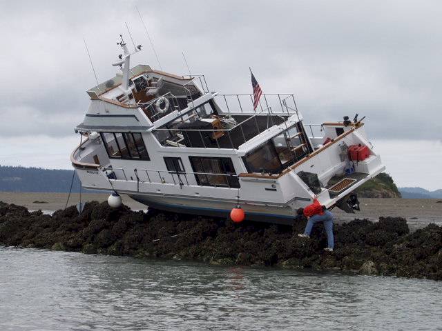 sailboat and a powerboat up on the rocks and, unlike my little skiff, both