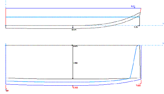 waterline is at a displacement of about 935 lbs. Short and stubby, it can