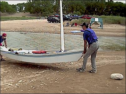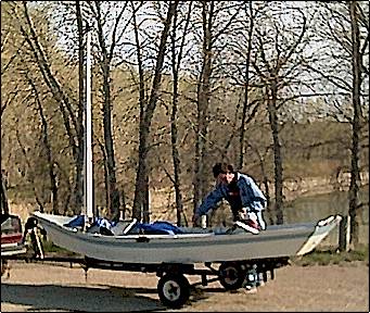 photo shows the boat on a trailer, getting ready to launch for a sail with