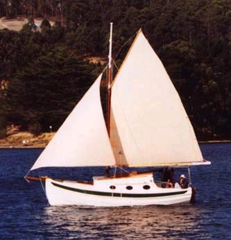 Mark tells me that he is amazed at the space inside, he compares her very favourably with a 26 foot long keel yacht that he knows well, and has sent me a photo of his Daughter standing with comfortable headroom under the main hatch of this 22 ft ( 6.4m) Gaff rigged trailer yacht.