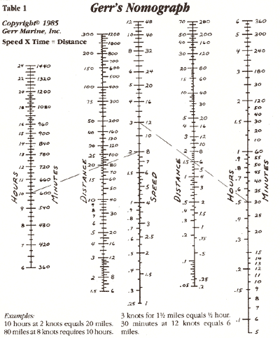 One of the most basic navigation problems is knowing how far you've gone, or how far you have to go. I made up a nomograph (commonly found in applied engineering handbooks) that can solve any speed, distance, time problem with speeds from 1/4 to 48 knots and times from 5 minutes to 24 hours. I call it Gerr's Nomograph (below).