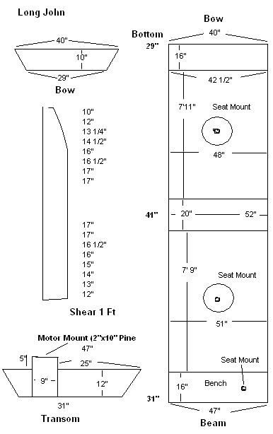 Attached is the data I recorded. If anyone wants to put it into a boat design format - "be my guest" (send me a copy!). You will notice she is long - nearly twenty feet, making it possible for her to achieve a good pace with a small outboard. With so much flare I did not realize she was so narrow until I started taking measurements - at the waterline she is 31" at the transom, 41" amidships, and 29" at the bow. Note the bottom is not a rectangle - narrows at both ends. While measuring I also noted lots of fore and aft rocker (5" aft, 7" fwd) - this would help such a long boat stay nimble in the currents.