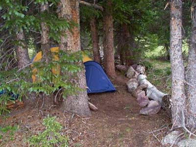 Willing hands set up a comfortable camp with five tents. Each of the kids (4) wanted a little privacy, so they brought their own. Anita and I had ours, and we brought the old green wall tent for supplies. Then a very strange thing happened: As this was pretty open range, the Boy Scouts camped up the valley (several hundred yards) had hobbled their horses, but they were free to come to our camp and see if we had treats. The boys (Daniel, Josh, and Aaron all 17 yrs) camped a hundred yards or so away from our main camp, and the horses went to their tents first. So they set up little fences and barriers made from rock and fallen wood. And then they started to get fancy. Pretty soon three 17 year olds were staggering around under the weight of fallen logs and rocks creating walks, patios, and then covering the walks with soft rotted wood. What a funny thing play is. We would have gotten sullen, icy stares if we would have told them that it was time to set up the tents, and then spend the rest of the afternoon decorating their campsites!!