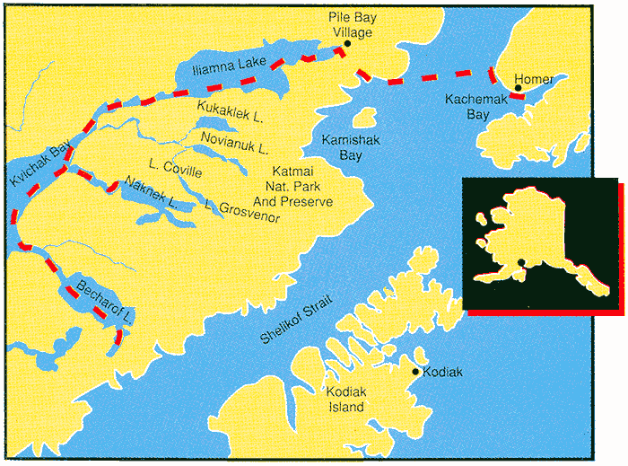 Point to follow the rocky shoreline 20 miles to Iliamna Bay.