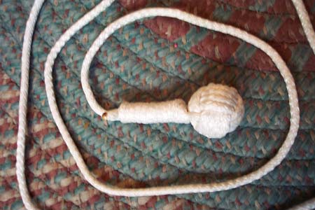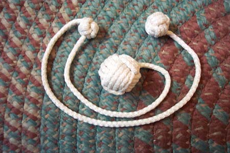 With a bit of modification, however, another use presents itself. In a day when braided rope is the norm, most of the traditional rope end knots, which are formed from stranded rope, are impractical. By the simple expedient of knotting the working end of the rope and drawing it back into the knot, the Monkey Fist becomes a bulky and attractive rope end or stopper. Its biggest drawback in such a role is that the knot eats up a LOT of rope, on the order of 100 times the rope's thickness.