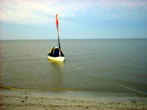 Anchoring in the Holder is a much simpler affair than with a typical pocket cruiser. I have a heavy duty plastic tent stake that I use on the beach, and a folding grapnel anchor for out in the water. Used in a Bahimian Mooring fashion, it will keep my little boat the perfect distance from the shore. Must note that if you just put the tent stake in the top sand, it won't hold very well, so I dig down a bit and push it into the deeper more dense sand. Why anchor you might ask? Well, beach cruising is great, but if you are going to a new area, you might arrive and discover grass and mud right up to the water's edge, or possibly a rock and shell beach that won't make for a very good bed. Also there is the legal aspect of whether you have permission to setup camp on the shore. Being able to anchor out offers you more flexibility in the areas you can explore.