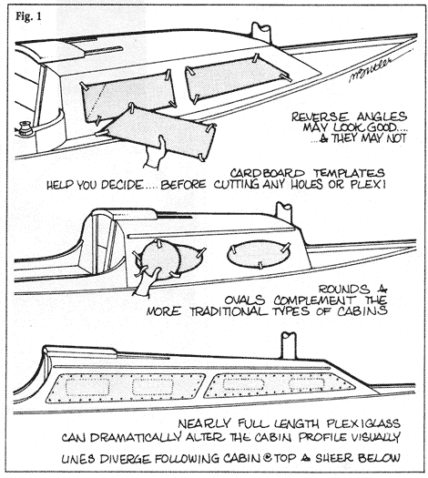 Ports may be fitted anywhere — in the cabin sides or top, on deck, or even in the bottom for underwater sightseeing. The challenge comes in choosing the best for the job and placing the lights intelligently and esthetically. Locating a series of ports along a cabin side requires some eyeballing, possibly aided by cardboard cutouts held in place with double-faced tape, and maybe a straightedge to maintain a fair line that flows with the lines of the boat (Fig. l). Very small alterations often make a lot of difference, so care should be taken before any holes are cut. The ports can follow the deck line, the cabin top, or any esthetic combination of the boat's lines as long as they look right.