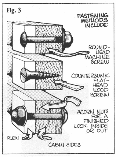 If the cabin side is thick enough you may wish to countersink the nut and washer on the inside, or you can fit them flush and use an acorn nut over the end, giving a more finished look (Fig. 3).