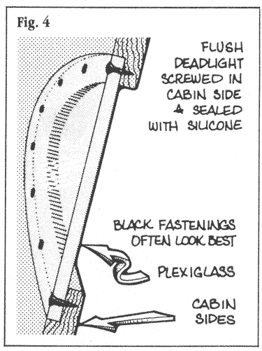 Silicone is a good sealant and bedding for the ports, regardless of size. But the port must be dry and clean. Apply a substantial bead around the perimeter of the port, and as you tighten the fastenings, you can visually inspect the seam to ensure a complete seal. You can form a small finger fillet with fresh silicone seal by wearing a rubber glove or using a tongue depressor, but work fast since it sets very quickly. After the silicone sets, it can be sliced clean with a razor blade to remove the drips and smears. If you want a flush-fitting deadlight, cut a rabbet in the cabin side, hull, or deck (Fig. 4), or if the light is the same thickness as the deck, epoxy-glue a backing plate or perimeter ring on the inside to support it.
