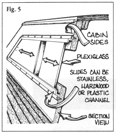 Sliding ports are not traditional, but properly designed and built, they do have a place on small boats. They are adjustable for ventilation, take up no extra room, and are easily built. They are not absolutely watertight if waves comes over the cabin top, but they do drain well. The slides can be made of epoxy-sealed hardwood, stainless steel, or perhaps RV-type plastic channel (Fig. 5). The best channels use a double groove to separate the two pieces. They may beheld open or closed with hooks or shock cord, and the necessary friction may be furnished by a thin felt or brush-type gasket placed between the sliding sections.