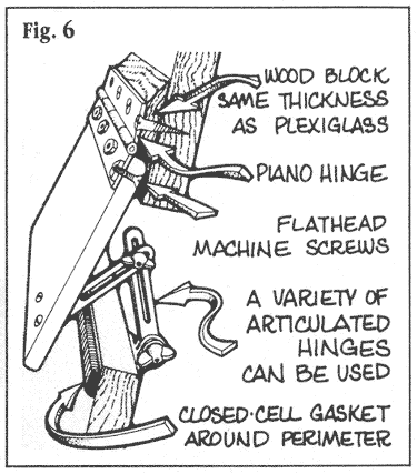 Hinged ports can provide very good ventilation, even during a rain. They can be made much tighter than sliding ports by using gaskets and dogging them down. Where structural strength is required, a piano hinge is the attachment method of choice (Fig. 6). The hinge should be secured using a drop of epoxy in each screw hole to lock it tightly and prevent rot. Since no moldings are required with hinged ports, they can be any shape or configuration without much extra work.
