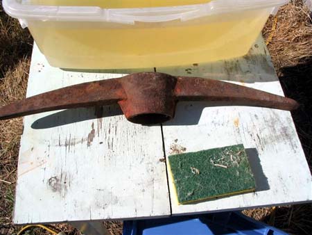 This is the pickhead before derusting filling in pits and casting numbers and sharpening points to original condition. It is probably about four ounce heavier here also because of the sharpening and huge amounts of rust still on it.