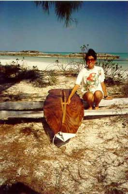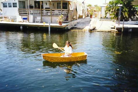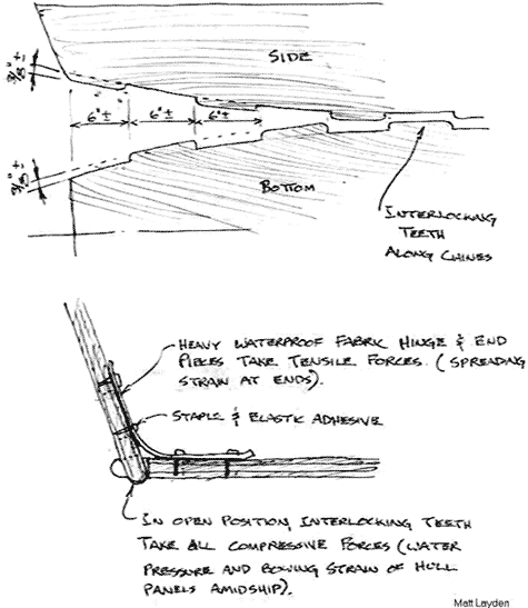 The Micro Folding Dinghy is based on one of Matt Layden's early folding dinghies; however it incorporates some of Matt's ideas as well as a few of our own to create a cheap and sturdy boat. The Micro Folding Dinghy is best suited to smaller people or for children, but it can be enlarged to fit larger folks by increasing the beam and the freeboard by around 2 inches. The MFD is made up of 3 pieces of 1/4" exterior grade fir plywood- two side pieces and one bottom piece. The ends (bow and stern) of our boat are white vinyl, but canvas may work better. One of the most interesting features of this little boat are the 2" wide cloth hinges made from heavy duty #4 canvas which are reinforced by a series of interlocking finger joints/tabs every 6 inches. At the stern the tabs are elongated to form skegs.