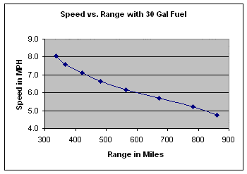 So since reliability is an issue for the cruise, let’s take a look at the engine. The Honda 9.9 will be running at 8 Hp at 7 knots, which is 80% of its rated power. But since it’s actually a 15 Hp engine already de-rated by the manufacture to 9.9 (with a limit screw and smaller jets) it could be said that it’s running at 53% of 15 Hp. That sounds pretty reliable, but I will need to check with Honda to be sure. And if I need to extend my range, look what happens when I slow down. 300 miles should be a piece of cake. George Bueller would like this sort of thinking.