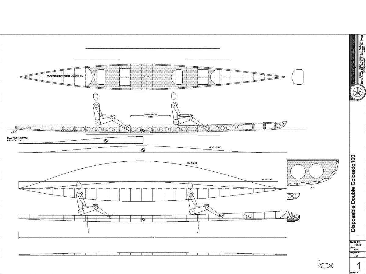 Going to build a skin on frame doubles boat as easily as possible that is still quick and easy to paddle. To be quick it needs to be long, 24’ in this case. Time (advancing age) has shown me the light regarding seat position, higher is better. Once you’re up a little bit a true flat top boat will work with foot wells the only thing dipping down into the hull. Pretty simple. Custom foamed seat pads can sit right on top with a little help from some velcro. A few tupperware containers let into the deck between us and we’re ready to go. A small poptop or screwlid opening at the very bow and stern will really expedite getting the inevitable moisture out of boat interior. Moisture may be in the form of condensation or gasp, a gash. A gash is really not that big a deal, most of the Colorado is knee to waist deep, and the sealed hull will build up a little internal pressure and slow a leak down. At least it did in the LeastieBeastie when I was out in the middle of Lake Hamilton years ago, but that was surely the hardest I’d ever paddled.