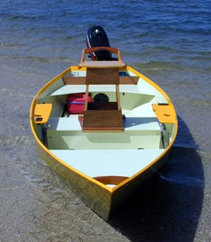 The boat can be rowed or propelled by outboard gasoline engine or electric. I recommend a 2 to 3 HP motor. With two on board the best seating is at the fore and rear seats, and the boat motors along well balanced and the hull draws 100mm water. Due to the skeg the hull will drift in about 150mm water. We have recently motored in 15knot conditions with little spray entering the boat as the boat punched into the waves. The boat rises easily to wave swell and handled the bow waves of passing boats from front on, side on and from astern; quite admirably. When there is only myself at the tiller, I carry a jerry can of water strapped in at the fore seat to assist the balance. To try and rise the hull to the plane is a waste of effort as it travels best at displacement speed, for which it is designed. Great for trolling also.