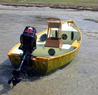 Since we tow a trailer-home a car-topper was the solution. Hence size and weight became very important. For ease of propulsion and stability the dory lines became the initial hull shape and further enhanced with the help of ProSurf3 to configure for an outboard at the transom. Lightweight monocoque construction or stitch and tape plywood was to be the construction mode. Propulsion achieved by rowing or outboard motor.