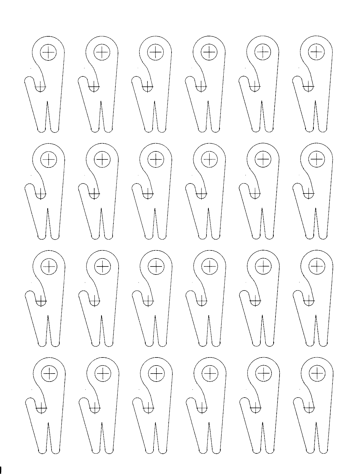 It is a page of 24, 2 1/4" X 1", cleat patterns which can be printed and then attached to any appropriate 1/4" thick material with spray adhesive and then cut out. The large hole is 1/4" beveled both sides with a 1/2"