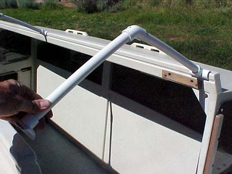 With the recent increase in "slot top" cabin boat construction there seems to be more and more inquiries about how to cover that open slot against the elements. Hard covers present the challenge of design, construction, fitting, securing and storage. Way too much thinking and work for me. Soft covers offer a cheap, easy solution. A small section of any waterproof tarp will do. Heck you can even buy a new polytarp large enough to cover the slot for less than $10. OK, so you have a tarp, you cut it to size (make it much wider than the slot, best to make it nearly as wide as the cabintop to keep rain from blowing under it), and you have grommets installed around the tarp perimeter. Now you need to make some suitable attachments like eye pads (or a handrail) to the outer edge of the cabintop. Might as well make these substantial enough to use as tie downs for oars, boom, mast or whatever you might want to lash to the cabintop when spending some time at anchor. When aboard, run small line from the tarp grommets outboard to the eye pads and back under the tarp into the cabin so you can stretch the tarp tight from inside the cabin. Now all is well until it rains and your tarp sags from the weight of the water it collects... Here's an easy solution to that problem... good old 1/2" pvc pipe and fittings. Cut the top off of some T's and glue them to some pipe with a 45 degree elbow in between and you'll have some pressure fit rafters for just a few cents each.. Easier to describe these with photos than words so look here.