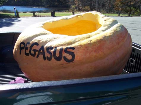 Aided by his lifting team, dubbed ‘Team Pegasus’, Fitzgerald transported the pumpkin to a local fair on Labor Day weekend garnering 4th place in the giant pumpkin contest. The day before the scheduled voyage, Fitzgerald spent three hours scooping out 200 pounds of pumpkin guts for a seating compartment, leaving walls about two inches thick – the amount an engineer had told him would create enough displacement to float his boat. The thinner the shell the more streamlined the watercraft he claimed. The next morning, Team Pegasus was busy again transporting the behemoth, this time to the boat ramp at a local pond.