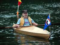 I have to admit, the boat did leak a little. In the rush to get the boat done by the Festival time I put the boat in the water before it was completely finished and had forgotten to put in the inside layer of glass on the "Payson Butt" strake joints for the garboards. With just a single Wetting" coat of epoxy on the outside of the boat a slight trickle of water seeped in, right in front of the seat. Oops ! !