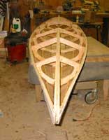 The 15 foot Kayak is built of cheap 1/4"- Luann using an old, delapidated Folbot "Sporty" for rib, bow and stern and bottom patterns.