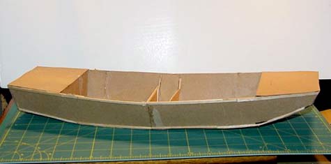 The main point of this email is to send along a pic of the card model and another pic showing the RR12 project at it's beginnings. Just the two center seat forming sections mounted in tandem on a strongback which is actually an old bookcase set on it's side and raised off the floor by the recyling tubs. The sides (not shown) are almost ready to attach to these pieces. After that it's going to start looking like a boat very quickly.