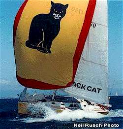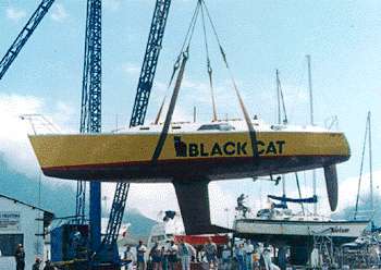 Back ten years ago, at the time I was drafting my story, yacht designer Dudley Dix was about to turn over his new yacht. A Plywood/Epoxy 'DiDi 38' and eventually it was named 'Black Cat'. Then a Peanut Butter manufacturer of the same name, became a major sponsor, that boat was a groundbreaker in that the design was done to suit Dudley’s own cashbook and a change in wood/ply/epoxy construction. In that it was the first such Radius Chine design by Dudley, possibly by anyone. I became one of the crew that helped turn Dudley’s new hull over; it was a day to remember and a good after party too...