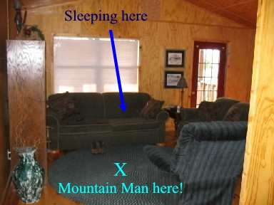 There is a motion activated light in front of the cabin - every now and then the wind blows hard enough to activate a searchlight bright beam of light - it blasts through the glass in the front door right into my eyes. I close them tighter but it’s like trying to sleep at noon, in the desert, with no shade. My eyes are tightly closed but I still see motion, a shadow moves in the bright light! It dawns on me I am not alone! Huh?!! I open my eyes - heart racing, blood pounding in my ears, and two feet away is a silhouette of a huge hairy mountain man, bent down, inches from my face, drawing a knife to ruthlessly murder everyone in the cabin! I soon discover my “fight or flight” reflex is really a whimper or scream reflex. I screamed - sorry to say, not exactly a manly scream either! Of course, even a squeaky little girl scream at 2:00 in the morning in a stone still mountain cabin is sure to draw the attention of the other occupants! The first response was from my wife who was standing two feet in front of me - “Larry you dumbass, it is me!”