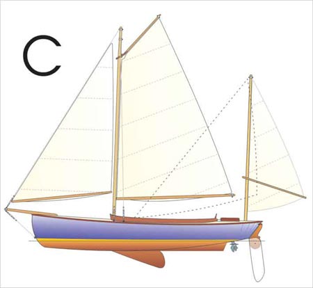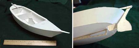 Our design objectives were (1) an easy-to-fabricate shape with (2) a hidden motor well, (3) a flexible sail plan for our unpredictable coastal conditions and (4) be able to scoot across those shallow Oregon tidal flats. Several sheets of mat board and dozens of hot glue sticks later, I had a model that looked pretty boat-like. Her rounded stern gives it a classic look with lots of space for the motor, fuel and aft storage. Slicing up a pricey chunk of metal for a hull designed by this clueless beginner didn’t seem smart so some help was in order. Paul Riccelli, a designer in Florida, provided excellent design concepts backed by a solid grasp of sail physics, common sense and personal experience.
