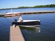His most obvious change from a "Sneak" was his making it a completely open boat, doing away with any foredeck at all, it leaves a 22 foot long strolling area, and with her flat bottom, Loon is so stable you can wander from end to end with your hands in your pockets. John did away with fixed seats, simply tossing in a few lawn chairs, and set up a lever steering staff, with a custom made wooden extension. His favorite cruising station is seated on the fore rail, peering over the side for sunken Rideau Canal treasure, steering by the extension with one hand. I'll leave it to the minds of the readers, what he (or I!!!) might have in the other hand. Suffice it to say, there's tons of room for a few beverage coolers onboard Loon.
