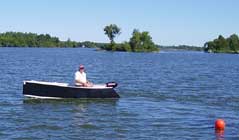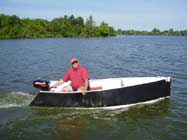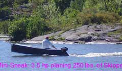 Steve Bosquette, a Sneakeasy builder, made a half length version he called "Mini Sneak", a twelve foot by four foot beam flat bottom power skiff, it planed with a 3.5 hp! Not with me of course, I'm a tad too big, but with Steve and shall we say, more compact skippers, Loonette (my nickname) did indeed plane about on a miserly 3.5 hp!