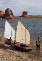 My first job Friday morning was to raise our colors: the Skull and Crossbones. I hoisted the flag on an aluminum windsurfer mast as a marker to guide lost souls to the right spot. The rest of the Kokonauts began to trickle in from their Lake Mojave cruise: Jim Thayer with his Nina double-ender, the Gales (Tom, Heather, Will and Ruby), with Heather’s beautiful Whitehall and Tom’s new Van Gough boat, and Ron Roberts with his Rube Golbergian forward-rowing sailing canoe. And there were returning messers-about from last year: Bruce Anderson, rumored originator of the messabout, with his new PD Racer, Randy Swedlund with his self-designed sail/row/motor skiff and Chuck and Sandra Leinweber with their canvas-on-frame kayaks, all the way from the Gulf Coast. Conspicuously absent were Dave and Anita Hahn. If we’d only known that they were stranded somewhere outside of Hanksville with trailer problems we might have been able to mount a rescue mission. Later, newcomers Alan and Jeanie Donaldson drifted ashore in their Seapearl trimaran.