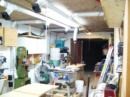 I built a dual 4 inch sewer and drain rig, running two pipes out of a Harbor Freight ($159.00 on sale) 2 HP Dust Collector down the center line. This dual pipe (could be one six inch or two four inch pipes) lets the DC run just below its maximum CFM. One drop per line to the side of the shop and two blast gates at the Dust Collector near the garage doors next to the infernal washer and dryer. The hose is 4" and where possible goes two hoses to a tool or a 2-1/4" shop vac hose goes to a tool or sander. If possible, I also use a four inch hose in the case of a tablesaw or belt sander or other heavy tool. As long as two blast gates are open, it pulls to its best CFM, (all specs lie, but close enough). The overhead centerline run is very good for sanding canoes or long flat surfaces. There is lots less tripping over the hose, pulling the damn shop vac around while it whines like a jet engine.