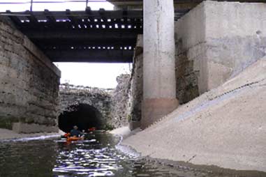 We took a detour up Crab Creek for a couple of hundred yards. When I was a child, I lived across the road from the creek, about 10 miles upstream from where it joins the Mahoning. At that end it is a beautiful little stream, full of crayfish, minnows, and fish, winding through a wooded ravine where I learned to love the forest, to fish, and to spend long summer days just exploring, wondering what I would see around the next bend. At the mouth here though, after running through much of the city, it is not so nice. Long ago it was channelized where it ran through Republic Steel’s land. Walls 12 feet high were cut from stone in 1879 (from a date carved into one of the blocks) and the land filled in behind. It makes an interesting trip though, if one can stomach paddling through the water, which smells bad (A guy from the state EPA told me once that there were essentially no functioning septic systems attached to houses more than 20 years old in the county, and Crab Creek smells like it).