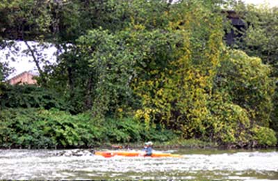 So we turned around and paddled back out. Back at the creek mouth, we turned back into the current, and passed a giant reinforced-concrete bridge abutment that marks the beginning of the end of the trip. The river here passes through an area of waste land, the warehouses and railroad switching yards that covered it are long gone, taken to pieces and sold for scrap. There are some nice little riffles, and an island or two, and this is the place where you can see deer and fox, ground hogs, minks and whatnot in the evenings. For a few years there was also a nesting pair of barred owls in a big old oak on the bank. They were beautiful to see as they started up at my approach and flew heavily off among the trees. A pair of red-tailed hawks were playing in the sky as we passed today, and as a bonus surprise, there was a new, awkward and dangerous strainer in a chute where the whole river narrowed down to about 20 feet and ran strong and deep.