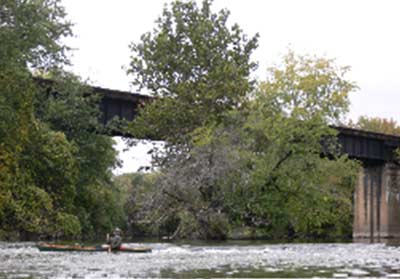A couple of hundred yards before our pullout, there was one last low weir with an island built up behind it. The river is runs between walls here, dug in and built up over the years to protect the railroad yards and tracks. In the spring, when the river is high, the island and weir are covered with a maelstrom, whirlpools 15 feet across, big standing waves, the works. I have run the river a couple of times when it is up, but mostly I pull out upstream. One time though, I left work early after writing up a particularly horrible murder-suicide, and just had to get in my canoe and paddle it off. The river that day was running something like 8 feet above normal. The various dams and weirs were so far under water that they were little more than bumps in the water and the trip went twice as fast as usual. When I got to the place where I usually pulled out at high water I got out, and then decided to walk down and scout the rapids. I didn’t want the trip to end that day, and after a minute, I saw what looked like a workable line through. When I pulled out at the other end of the rapids, I was walking on a cloud, and the feeling lasted through the ride home and a party. Then I checked my messages.